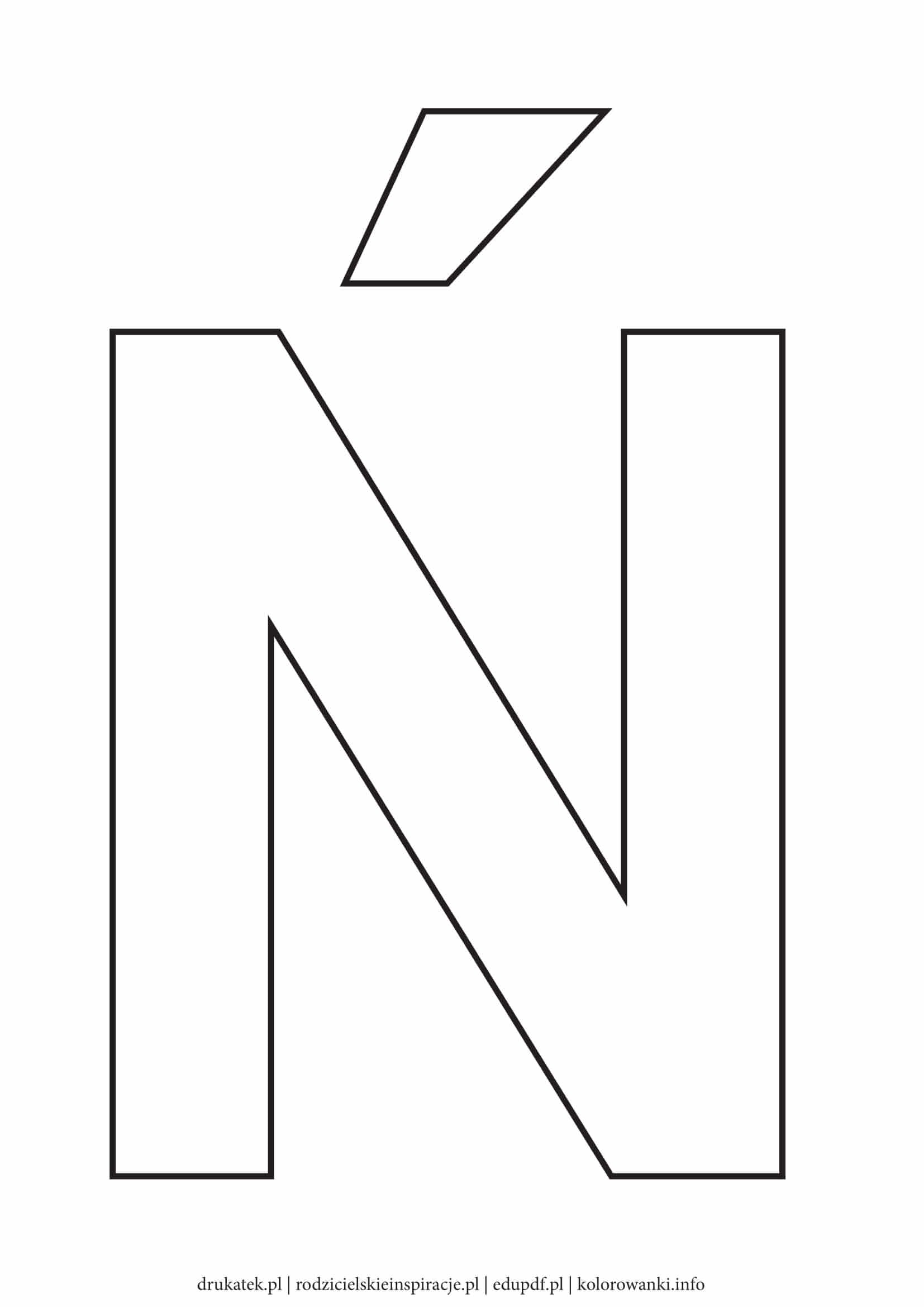Litera Ń do druku za darmo. Pobierz szablon i wydrukuj go bez żadnych opłat. Litery do druku przydają się do wielu rzeczy. Nauka dzieci to tylko jeden z niewielu aspektów, w których można je wykorzystać. Litery do druku przydają się również kolorowanka, a także do tworzenia girland czy innych napisów i elementów ozdobnych.